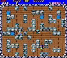 With each successive floor, the speed and intelligence of the pirates increases. For every sixteen barrels Momotaro destroys, he will be rewarded with an item that grants invincibility for a limited amount of time, allowing him to defeat enemies by simply touching them. Momotaro's enemies do not have attacks, but a single touch from an enemy will cause him to die and be revived, costing the player one extra life; the game ends when the player runs out of lives. When a player has scored more than 1 million points, the game will stop awarding the player with bonus lives. The game has no ending and loops indefinitely after level sixteen. The enemy patterns and color will reset to level one but the game will not reset the deck counter. The layout of the barrels on the stages will continue to change, however, and the enemy count per level will not reset to level one counts.