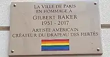 The official plaque in memory of Gilbert Baker, voted unanimously by the Council of Paris,[3] is situated on a wall of the square.[4]