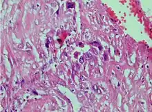 | Photomicrograph showing proliferating intermediate trophoblast with scarce cytotophoblastic and syncytiotrophoblastic elements | |