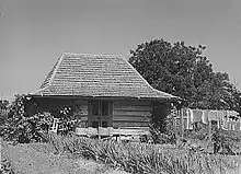 The smokehouse was utilized to preserve meat, usually pork, beef, and mutton. It was commonly built of hewn logs or brick. Following the slaughter in the fall or early winter, salt and sugar were applied to the meat at the beginning of the curing process, and then the meat was slowly dried and smoked in the smokehouse by a fire that did not add any heat to the smokehouse itself.[21] If it was cool enough, the meat could also be stored there until it was consumed.[17]