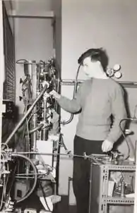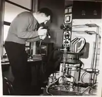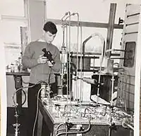 Swann attending to his original prototype glow discharge equipment in the laboratory at STL Harlow, Essex in the 1960s. It represented a breakthrough in the deposition of thin films of amorphous silicon, silicon nitride, silicon dioxide at temperatures significantly lower than that deposited by pyrolytic chemistry.