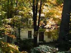 The Plaster House is located in a rural setting of southeastern Southbury, on the south side of Plaster House Road near its western end at Jeremy Swamp Road. It is set on a parcel overlooking Jeremy Brook to the east. The house is a small 1+12-story masonry structure, built out of small rubblestone and covered in stucco. It has a gambrel roof pierced by two shed-roof dormers, with stone chimneys in the end walls. The main facade is three bays wide, with sash windows on either side of the entrance. The western gable is finished in stone, while the eastern one is framed in wood and finished in clapboards. The interior is divided into two chambers, with the larger one historically serving as a parlor and the smaller one as a kitchen. The stonework of the chimney and fireplaces are fully exposed, an unusual condition that appears to be original.[2]