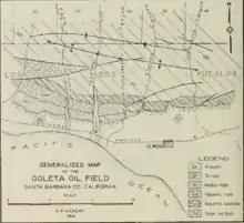 - ↑ Vickery, Frederick (1943). Goleta Oil Field, in Geologic Formations and economic development of the Oil and Gas Fields of California. San Francisco: State of California Dept. of Natural Resources Division of Mines, Bulletin 118. pp. 377–379.