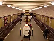 The station was designed by Alfred Grenander. For topographic reasons, it lies unusually deep underground and the station was therefore constructed with an unusually high vault and long platform.[1] Grenander made exceptionally expressive use of the play of light and shadow in the vaulting and its supports.[2] It is one of only 2 Berlin U-Bahn stations with no central columns, the other being Märkisches Museum.[3] It is tiled in grey with black accents.[1]