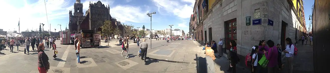 The space of the square would have been assigned by Hernán Cortés to the construction of the new cathedral of New Spain,[2] and would have been later occupied by houses assigned to the Cathedral chapter.[2] Around 1689, construction began in this space of the Real Colegio Seminario next to the cathedral,[2] which was inaugurated in 1697[2] and the rest of the space adjoining the Plaza Mayor (today of the Constitution it would be simply called at the end of the 18th century as the patio de la pila. Hereafter this plaza would be linked to the popular Paseo de las Cadenas, a space outside the cathedral lined with chains and iron posts, trees, masonry benches and lighting with public lighting.[7] The seminary was proposed for demolition in 18612 after confiscation of church assets, but the building was sold and the Hotel Seminario was installed in that place. offices of the Consulate of the United States, among others.[2] Henceforth the space would be known as Rinconada del Seminario, and at different times in the second half of the 19th century circuses, theaters and mechanical games would be installed,[2] as well as a car site and a drugstore also called Seminario.[2]