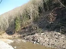 The clear-cutting of forests in the 19th century adversely affected the ecology of the Plunketts Creek watershed and its water quality.[32] Polluting industries on the creek and its tributaries then included a coal mine and tannery (which are long since departed).[6][33] In the autumn of 1897, three men working with hides at the Proctor tannery were stricken with anthrax, two fatally. Another four deaths originally blamed on pneumonia were suspected of being due to pulmonary anthrax, and some cattle drinking from Plunketts Creek downstream from the tannery were also infected.[34] As late as 1959, the sludge pile from the tannery was still visible in Proctor, but was not disturbed for fear of anthrax spores.[35] No acid mine drainage is reported in the watershed.
