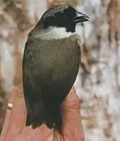 The poʻo-uli (Melamprosops phaeosoma) [3] or black-faced honeycreeper is an extinct species of passerine bird that was endemic to the island of Maui in Hawaiʻi. It is considered to be a member of the Hawaiian honeycreepers, and is the only member of its genus Melamprosops. It had a black head, brown upper parts and pale gray underparts. This bird inhabited only the wetter, easternmost side of Maui, where it had rapidly decreased in numbers. With extinction threatening, efforts were made to capture birds to enable them to breed in captivity. These efforts were unsuccessful; in 2004, only two known birds remained, and since then, no further birds have been sighted. A 2018 study recommended declaring the species extinct, citing bird population decline patterns and the lack of any confirmed sightings since 2004,[4] and in 2019, the species was declared extinct.
