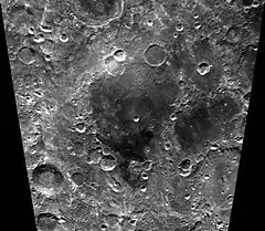 The eastern half has been completely worn away, and much of the interior has been resurfaced by lava flows. This surface has a lower albedo than the surrounding terrain, giving it a dark appearance. A rugged formation forms a low north–south range across the eastern section of the floor, possibly the remnant of an inner ring.