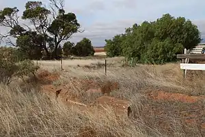 Point Pass railway station opened on 9 December 1914 after a railway line to Robertstown was built from Eudunda on the Morgan railway line, going through Point Pass on the way.[1] Point Pass served both passengers and freight. The station closed as regular passenger services ceased on 23 September 1962. The station was demolished soon after, but the station sign was left at the site. With traffic on the line dwindling, the last passenger train to pass the station was run by Train Tour Promotions using locomotive 804 to farewell the line on 20 May 1989.[2] Less than a year later, the final train to pass the station, a grain train departed Robertstown on 21 February 1990. AN formally closed the line on 25 February 1990.