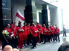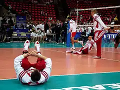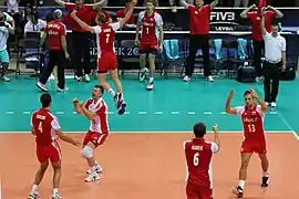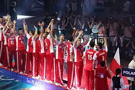 On 30 August 2014, Poland played their historic match at the National Stadium in Warsaw against Serbia as opening meeting of the 2014 World Championship.[38] It was the opening match of the World Championship 2014 in Poland.[39] Polish team won 3–0 and with attendance over 62,000 audience.[40] In their first group, Pool A, Poland won all 5 matches and lost just one set with Cameroon. In their second group, Pool F, the host team won 3 of their 4 matches. On 10 September 2014, they lost to the United States (1–3), but then beat the national teams of Italy (3–1), Iran (3–2) and France (3–2).[41] Poland took second place in Group F. The breakdown in the next stage of the tournament was decided by drawing lots. Poland went into group H with Brazil and Russia. Some commentators and fans called Pool H the "Group of Death", but it was a happy result for the home team. The Polish national team won two dramatic matches after tie-breaks at Atlas Arena in Łódź. On 16 September 2014 they beat Brazil. Poland's main scorer in the match was Mariusz Wlazły, who gained 31 points for his team.[42] Two days later, Poland needed just two winning sets for promotion to the semi-final. Poland beat Russia and took first place in the group.[43] On 21 September 2014 the Polish team won the semi-final match against Germany, which guaranteed for Poland their third ever medal at the World Championship.[44][45][46] On 21 September 2014 Poland won the title of World Champion 2014, for the first time in 40 years.[47] Poland beat Brazil (3–1).[48][49] Polish players received 3 of 8 the individual awards in the tournament: Karol Kłos as Best blocker, Mariusz Wlazły as Best opposite and Most valuable player.[50][51] After victory Poland have risen two places in FIVB ranking and has been taken 3rd place.[52]