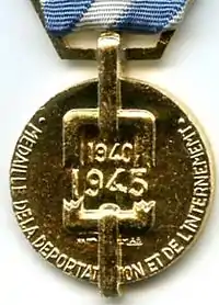 The Political deportation and internment medal (French: Médaille de la déportation et de l'internement politique) is a commemorative medal awarded by the Ministry for veterans and war victims of the French Republic[1] to its citizens who were deported or interned by the German occupation forces during World War II.[2]