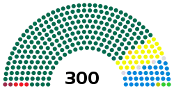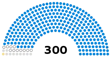 The 2018 Bangladeshi general election was held on 30 December 2018. On the election day at least 14 people died in violence between the Awami League supporters and the Jatiya Oikya Front supporters.[65] The Awami League returned to power winning 259 out of 300 parliamentary seats, making up the largest government body in Bangladesh after 1973 (where Awami League had won 293 out of 300 seats). The Jatiya Oikya Front only won 7 seats and alleged the 2018 election to be rigged and opted to boycott the parliament and stated that they would demand for fresh elections. The Jatiya Party became the main opposition party with only 20 seats.[66]