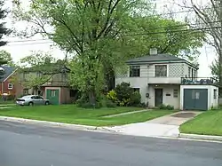 The Polychrome Historic District is a national historic district in the Four Corners neighborhood in Silver Spring, Montgomery County, Maryland. It recognizes a group of five houses built by John Joseph Earley in 1934 and 1935. Earley used precast concrete panels with brightly colored aggregate to produce the polychrome effect, with Art Deco details. The two-inch-thick panels were attached to a conventional wood frame. Earley was interested in the use of mass-production techniques to produce small, inexpensive houses, paralleling Frank Lloyd Wright's Usonian house concepts.[2]