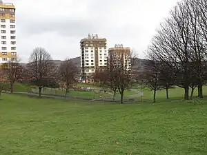 In the first half of the 19th century the lower part of The Ponderosa was open countryside just to the south west of the Sheffield General Infirmary which at that time stood in a rural location to the west of the town. During the second half of the 1800s an area of back-to-back houses known as the Port Mahon estate was constructed on the site. This housing stood until the 1960s when it was demolished as part of a programme of urban development in the Upperthorpe and Netherthorpe areas. Certain thoroughfares such as Wentworth Street, Watery Lane, Hammond Street disappeared and Burlington Street partially disappeared altogether and the housing between Martin Street and Wentworth Street was replaced by tower blocks and maisonettes leaving a central area for recreation. This recreation area was christened “The Ponderosa” by local children after the name of the ranch in the TV series Bonanza which was popular throughout the 1960s.[3]