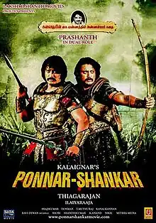 Ponnar Shankar is a 2011 Indian Tamil-language epic historical drama film produced and directed by Thiagarajan. It is a fictionalised account of the Ponnar Shankar epic, adapted from M. Karunanidhi's novel of the same name. It features Thiagarajan's son Prashanth in lead dual roles as warrior princes, portraying the title characters, with actresses Pooja Chopra and Divya Parameshwaran making their film debut as princesses and Prakash Raj as the main antagonist. The film also features an extensive cast of supporting actors with Prabhu, Jayaram, Khushbu Sundar, Sneha, Vijayakumar, Nassar, Rajkiran, Napoleon, and Ponvannan, amongst others. The background score and soundtrack of the film, composed by Ilaiyaraaja, with cinematography handled by Shaji Kumar and editing done by Don Max.
