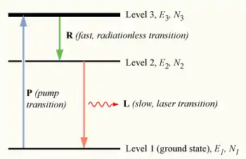 Initially, the system of atoms is at thermal equilibrium, and the majority of the atoms will be in the ground state, i.e., N1 ≈ N, N2 ≈ N3 ≈ 0. If we now subject the atoms to light of a frequency , the process of optical absorption will excite electrons from the ground state to level 3. This process is called pumping, and does not necessarily always directly involve light absorption; other methods of exciting the laser medium, such as electrical discharge or chemical reactions, may be used. The level 3 is sometimes referred to as the pump level or pump band, and the energy transition E1 → E3 as the pump transition, which is shown as the arrow marked P in the diagram on the right.