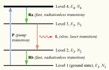 In this system, the pumping transition P excites the atoms in the ground state (level 1) into the pump band (level 4). From level 4, the atoms again decay by a fast, non-radiative transition Ra into the level 3. Since the lifetime of the laser transition L is long compared to that of Ra (τ32 ≫ τ43), a population accumulates in level 3 (the upper laser level), which may relax by spontaneous or stimulated emission into level 2 (the lower laser level). This level likewise has a fast, non-radiative decay Rb into the ground state.
