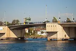 Porsgrunn Bridge (Norwegian: Porsgrunnsbrua) is a drawbridge constructed of concrete and steel. It is located in the town of Porsgrunn which is located in Porsgrunn Municipality in Vestfold og Telemark county, Norway. The bridge, which was completed on 13 October 1957, connects the eastern and western sides of the town center of Porsgrunn. It crosses the Porsgrunn River just east of the Frednes Bridge and about 3 kilometres (1.9 mi) near where the river empties into the Frierfjord. The bridge is about 283 metres (928 ft) long with a 40.4-metre (133 ft) long main span. Boat traffic beneath the bridge has an 8-metre (26 ft) bridge clearance.[1][2]