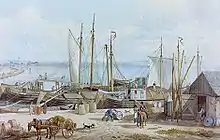 During the gradual Roman retreat from their remaining possessions in front of invading German tribes, some of the naval vessels were abandoned in a section of the port (likely around 407 AD, when the city was sacked for the second time).[5] Their remains rested in the earth and mud of the riverbank before being recovered 1981/1982 during excavation works for a Hilton hotel. They are now exhibited together with two life-sized replica ships in a dedicated local museum.[4]