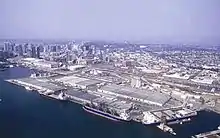 ![]() Aerial view of the Port of San Diego, showing three cruise ships and the USS Midway Museum. NAS North Island is visible in the background. | |