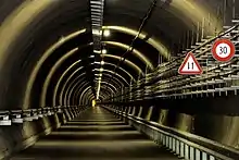 The multifunction station is located near a crossover between the northbound and southbound tunnels and is linked to the surface by an elevator, using 800 m (2,600 ft) tall shafts and a 1 km (0.62 mi) long access tunnel, exiting over the Anterior Rhine, south of Sedrun. This access was used for the construction of the tunnel and is now an emergency exit of the tunnel. Construction costs for a fully functional passenger station were estimated at CHF 50M ($39M, €32M, or £22M) in 2005[2] with annual operating costs of CHF 2.5M. It was initially projected to be opened in 2016 after the Base Tunnel was scheduled to come into service.