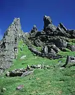 Skellig Michael (from Sceilig Mhichíl in the Irish language, meaning Michael's rock), also known as Great Skellig, is a steep rocky island about 15 kilometres west of the coast of County Kerry, Ireland. It is the larger of the two Skellig Islands. For 600 years the island was an important centre of monastic life for Irish Christian monks. An Irish Celtic monastery, which is situated almost at the summit of the 230-metre-high rock, was built in 588, and became a UNESCO World Heritage Site in 1996. It is one of Europe's better known but least accessible monasteries.
