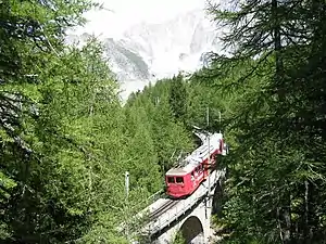 The Montenvers Railway or Chemin de fer du Montenvers is a mountain railway line in the Haute-Savoie region of France. The line runs from a connection with the SNCF, in Chamonix, to the Hotel de Montenvers station, at the Mer de Glace, at an altitude of 1,913 m (6,276 ft). The line is 5.1 km (3.2 mi) long and has a rail gauge of 1 m (3 ft 3.37 in). It is a rack and adhesion railway, using the Strub design to overcome a height difference of 871 m (2,858 ft).
