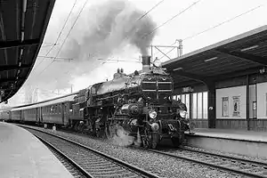 Preserved steam locomotive 41 1144 leaves Eisenach Hauptbahnhof in Thuringia (Germany) with a passenger train in 2006.