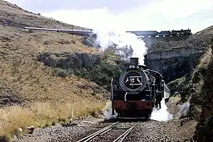 Two steam locomotive-hauled trains traverse the Aliwal North–Barkly East line in South Africa in 1983. The train in the foreground is in the 8th reverse station while the train in the background is in the 7th. This line was one of many South African lines that were abandoned in 2001.