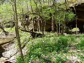 Portland Arch is one of only a few natural arches in Indiana. The arch was created through the Mansfield Sandstone by Bear Creek, undercutting the bluff on both sides. The sandstone was strong enough that it did not collapse. The Mansfield Sandstone is from the Pennsylvanian Period, some 230 million years ago. The cross stratification of the layers were formed in s shallow bottomed lake where it drops into deeper water. The slope reflects the change from the shallows into deeper water. Are like this were used as rock shelters by Native Americans and early pioneers. Along the valley escarpment, talus rocks have fallen into the valley.[1]