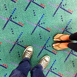 The carpet at Portland International Airport (PDX) in Portland, Oregon, featured geometric shapes on a teal background, representing the intersection of the north and south runways seen by air traffic controllers from the airport's tower at night. SRG Partnership designed it in 1987, and since then, the carpet has received much media attention.