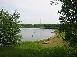 ![]() A view of the swimming area from the campground on the west shore of the lake. | |