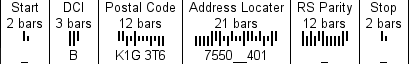 On the other hand, PostBar format D52.01, as described in and shown here, encodes the Postal Code using only twelve bars and an unknown symbology. It encodes nine alphanumerics in the Address Locater field using twenty one bars and another unknown symbology. It does not include any fields for space characters, but it does include twelve bars for Reed-Solomon error correction for a total count of fifty two bars.