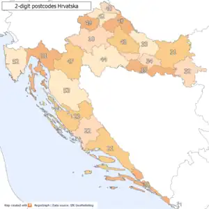 2-digit postcode areas Croatia (defined through the first two postcode digits)
