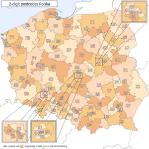 2-digit postcode areas Poland(defined through the first two postcode digits)