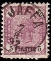 The stamps used were Austrian stamps for Lombardy–Venetia and, after 1867, Austrian Levant stamps, as pictured here.[47]