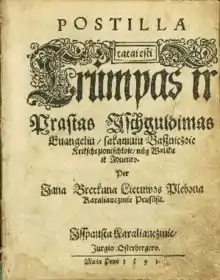 Postilė (full title: Postilla, tatai esti trumpas ir prastas ischguldimas euangeliu) is a 1000-page postil (collection of sermons and Bible commentaries) written in the Lithuanian language by Jonas Bretkūnas in 1591. It was designed for the purposes of Protestant priests serving Lithuanian communities in East Prussia (territory sometimes known as Lithuania Minor). The book was used until the 18th century.[1] Postilė is one earliest works in Lithuanian that were not merely translations but also included original texts.[2] It contains much ethnographic data about everyday life of the common people.[2] About 30 copies of Postilė survive; 10 of them are kept in Lithuanian libraries and museums.[3]