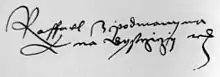 In the grave of Rafael a silver club was discovered from which a chalice was made. This was (in 1901) still in possession of the church. The chalice has the following inscription: "ARCUM SZUCSA SOLIS AEQUARI CURAVIT FERDINANDUS L 1528". The marble monument of Rafael Podmanitzky in Považská Bystrica is of interest because it has an inscription all around in old Slovak language it says "LETA PANIE TISICEHO PIETISTEHO PADESATEHO OSMEHO PRWNI STRZEDU W PUSTIE UMRZEL GEST UROZENY PAN RAFFAEL PODMANITZKY Z PODMANINA JEHOZ DUSSY PAN BUOH MILOSTIW RACZ BIETI ". The monument is on the right side wall of the Roman Catholic Church not far from the “Galerie”. It depicts a very tall man in full armor. The facial features are clearly chiseled in the stone.