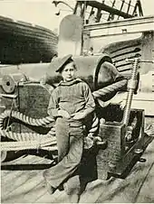 A powder boy or powder monkey manned naval artillery guns as a member of a warship's crew, primarily during the Age of Sail. His chief role was to ferry gunpowder from the powder magazine in the ship's hold to the artillery pieces, either in bulk or as cartridges, to minimize the risk of fires and explosions.[1][2][3] The function was usually fulfilled by boy seamen of 12 to 14 years of age. Powder monkeys were usually boys or young teens, selected for the job for their speed and height: they were short and could move more easily in the limited space between decks and would also be hidden behind the ship's gunwale, keeping them from being shot by enemy ships' sharpshooters.[4] These powder monkeys held no official naval rank on the ships that they sailed on.[5] Some women and older men also worked as powder monkeys.[6]