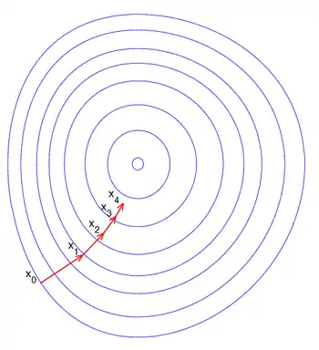 For example, to find a local minimum of a real-valued function using gradient descent, one takes steps proportional to the negative of the gradient (or of the approximate gradient) of the function at the current point: