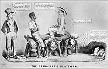 Buchanan and his allies in Congress worked systematically to undermine Douglas. By 1860 they had weakened his influence in the party; they had stripped away his patronage and removed him from the powerful chairmanship of the Committee on Territories. He was much weaker inside the Senate than before.[22] Nevertheless, Douglas had a powerful base outside Washington in the northern wing of the Democratic Party that was increasingly hostile to the president and his southern supporters. The battle with Lincoln in 1858 drew national attention, with Democrats reading Douglas's debates and hailing him as the victor, allowing Douglas to emerge as the favorite to win the party nomination for president in 1860.[23][24]
