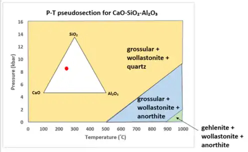 (Pseudosection is different from petrogenetic grid. Pseudosection shows different mineral phases for a single rock chemical composition,[25] while petrogenetic grid shows a set of reactions under different P-T conditions that would occur for a phase diagram.[1])