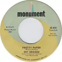 Early in 1963, Nelson was signed by Fred Foster to the label Monument Records.[6] In October 1963, Nelson sang "Pretty Paper" for Foster, who was impressed and decided to forward the song to Roy Orbison in London. Bill Justis worked the arrangements and the demo tape was sent to Orbison in England.[7] According to the official Roy Orbison biography,[8] The Authorized Roy Orbison, "Pretty Paper" was recorded at Decca Studio 2 in London with music director Ivor Raymonde, who made last-minute arrangements with his orchestra. Each musician was provided with microphones newly designed by Decca Records' engineers. The microphones were worn around the neck to amplify the strings. Orbison attended the session with a 102-degree fever.[4] According to the biography, Orbison recorded the song in 12 takes. The B-side, "Almost," [7] was also done that day.
