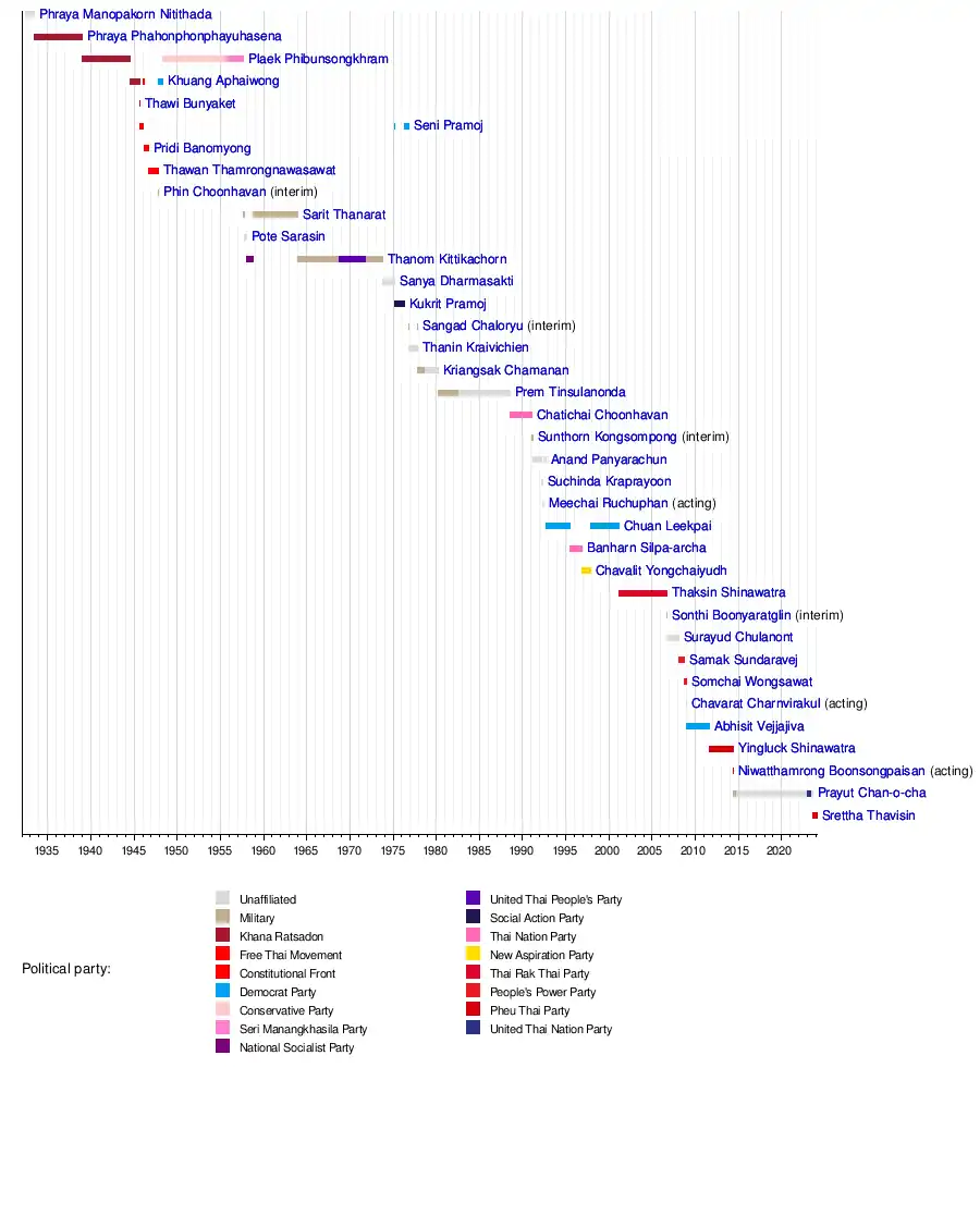 Srettha ThavisinPrayut Chan-o-chaNiwatthamrong BoonsongpaisanYingluck ShinawatraAbhisit VejjajivaChavarat CharnvirakulSomchai WongsawatSamak SundaravejSurayud ChulanontSonthi BoonyaratglinThaksin ShinawatraChavalit YongchaiyudhBanharn Silpa-archaChuan LeekpaiMeechai RuchuphanSuchinda KraprayoonAnand PanyarachunSunthorn KongsompongChatichai ChoonhavanPrem TinsulanondaKriangsak ChamananThanin KraivichienSangad ChaloryuKukrit PramojSanya DharmasaktiThanom KittikachornPote SarasinSarit ThanaratPhin ChoonhavanThawan ThamrongnawasawatPridi BanomyongSeni PramojThawi BunyaketKhuang AphaiwongPlaek PhibunsongkhramPhraya PhahonphonphayuhasenaPhraya Manopakorn Nitithada