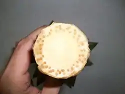 Root primordia (brown spots) as seen on the butt of a freshly cut pineapple crown intended for vegetative reproduction.