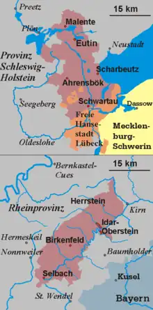 ![]() Prince-Bishopric of Lübeck (Dark blue) with in the Holy Roman Empire (as of 1648), the episcopal residence in Eutin shown by a red spot (other prince-bishoprics in light blue) | |||||||||