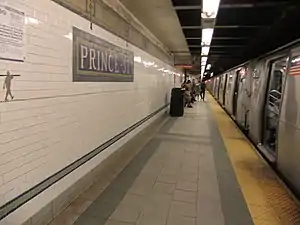 The Prince Street station is a local station on the BMT Broadway Line of the New York City Subway. Located in SoHo, Manhattan, it is served by the R train at all times except late nights, the W train on weekdays, the N train during late nights and weekends, and the Q train during late nights.