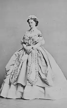 Furthermore, William had a reputation for drunkenness and a dissolute character, so it was surprising that the exceedingly pious and recently widowed Queen Elisabeth gave her consent to the match.[1] On two occasions William had been deprived of his command in the Prussian army and had recently proposed marriage to the celebrated ballerina Marie Taglioni; consequently he was generally considered to be the "black sheep" of the family.[1] Regardless, the Queen granted her permission, endowing her with a grand trousseau of lavish clothing and jewelry.[3] Her other uncle Emperor Wilhelm I gave her an opulent diamond necklace, while her mother Princess Marianne gave her a necklace of Siberian amethysts as well as an emerald diadem.[3]