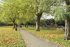 The park was created in two sections. Two parcels of land at the eastern and southern ends were purchased in 1891 by the Borough of Hornsey at the instigation of Henry Reader Williams and opened in 1896 as the Middle Lane Pleasure Grounds.[2] In 1926 the western section was added after the acquisition of a piece of land known as Lewcock's Field. During World War 1 this had been requisitioned by the council for allotments. After the war an initial plan for the council to develop the field for housing was dropped on grounds of cost, and an expanded park was renamed Priory Park.[3]