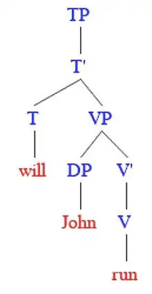 This refers to the fact that every individual piece of a syntactic structure is part of a particular category[1] (i.e. “John” is a member of the category Noun and “run” is a member of the category Verb). The Projection Principle requires that reference to these categories surfaces at every level of a syntactic phrase structure.[2] This requires a knowledge of arguments and internal structures. “John” may be a noun, but nouns are always dominated by a determiner phrase (DP). The verb “run” does not select for the noun “John”, but rather it selects for the DP “John”. The Projection Principle simply states that when notating the syntactic structure of a sentence such as “John runs fast.”, we must specify at every level what lexical category each piece of the sentence belongs to[2] Two common ways of notating the syntactic structure of a sentence under X-Bar Theory include bracketing and tree drawing.